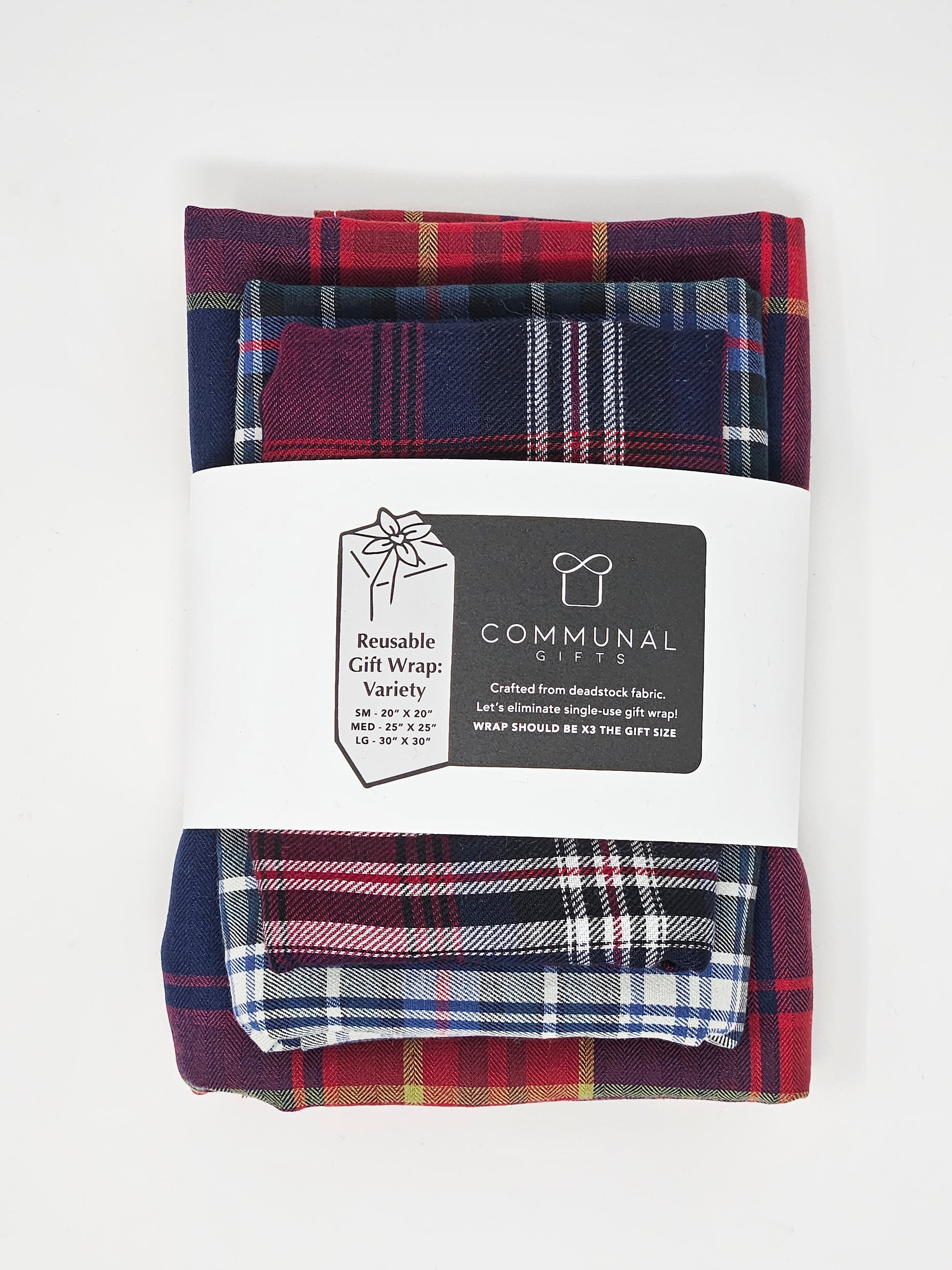 This Holiday Bundle includes three sizes — Small, Medium, and Large — in three unique holiday designs made from deadstock cotton fabric. Hand-sewn with care in the U.S.